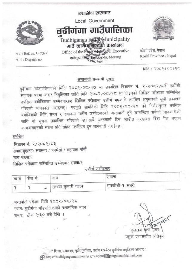 बुढीगंगा गाउँकार्यपालिकाको कार्यालयमा कार्यरत कर्मचारीहरुको सम्पर्क विवरण