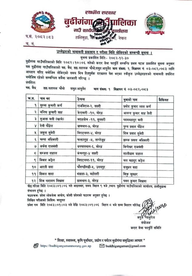 उम्मेद्वारको नामावली प्रकाशन र परीक्षा मिति तोकिएको सम्बन्धी सूचना ।