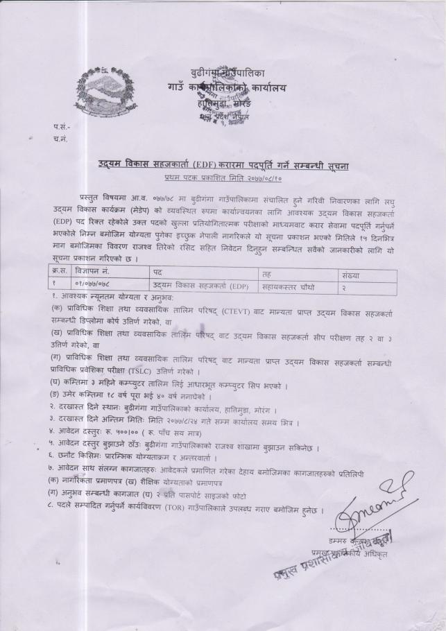 उद्यम विकाश सहज कर्ता (EDF) करारमा पदपुर्ति गर्ने सम्बन्धी सूचना