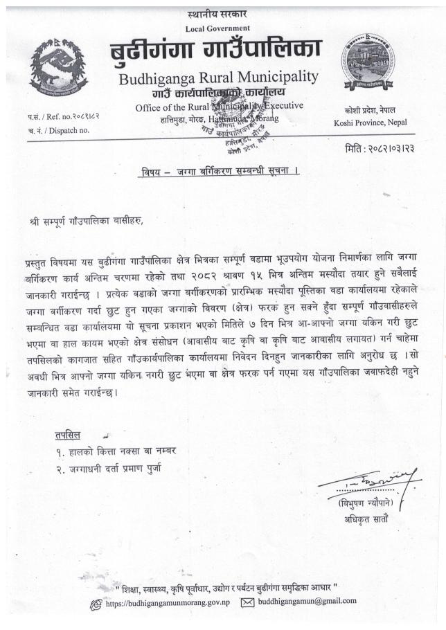 जग्गा बर्गिकरण सम्बन्धी सूचना ।