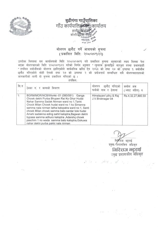 बोलपत्र छनौट गर्ने आशयको सूचना
