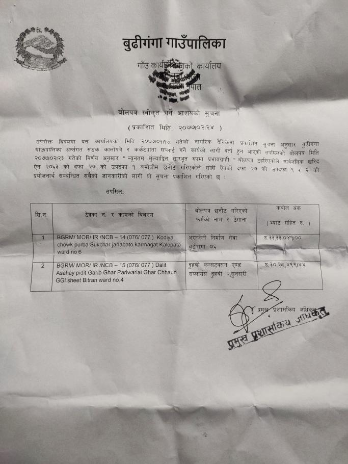 » बोलपत्र स्वीकृत गर्ने आशयको सूचना