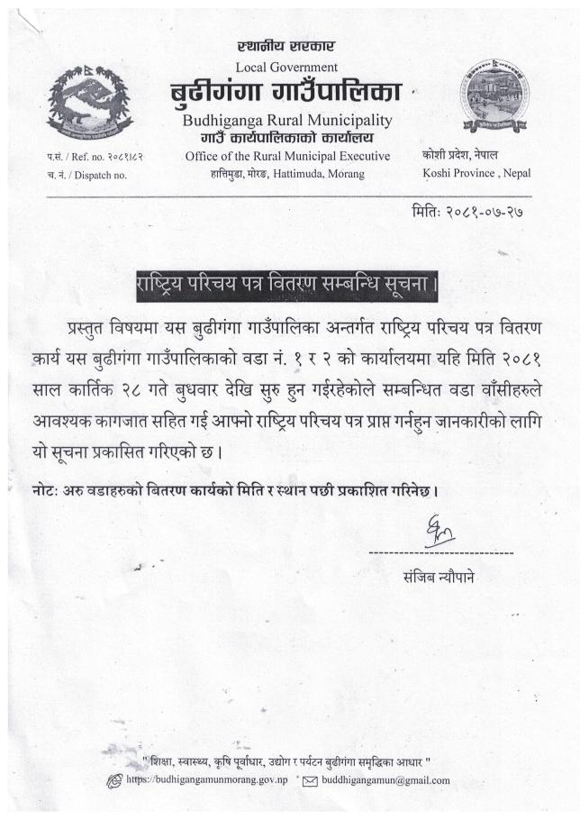 » राष्ट्रिय परिचय पत्र वितरण सम्बन्धि सूचना ।