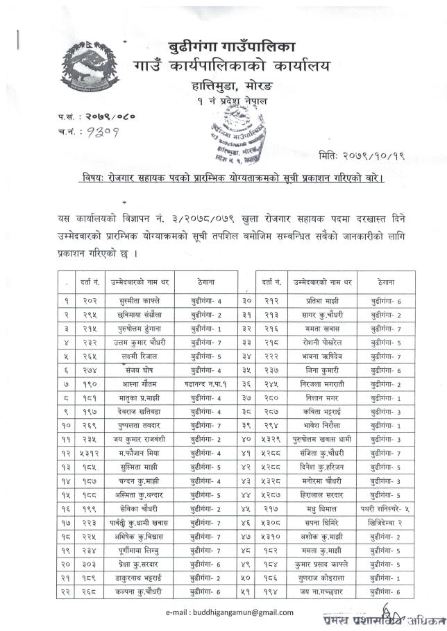 रोजगार सहायक पदको प्रारम्भिक योग्यताक्रमको सूची प्रकाशन गरिएको वारे