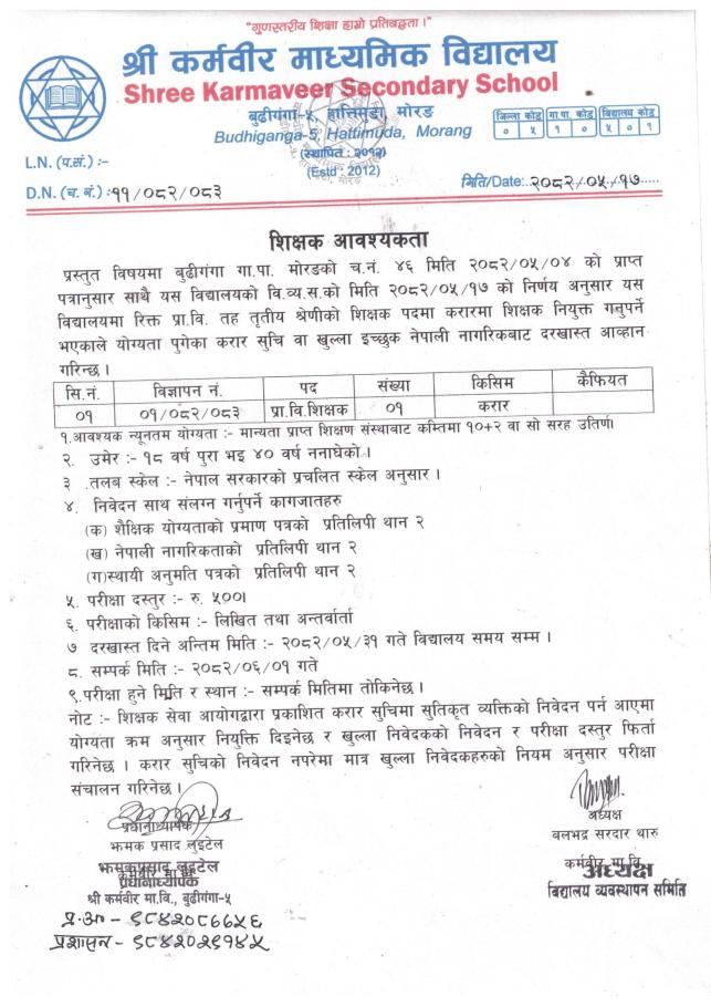 शिक्षक आवश्यक्ता ।