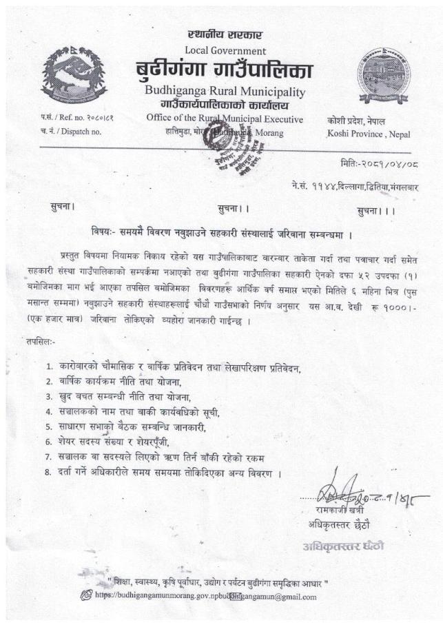 समयमै विवरण नबुझाउने सहकारी संस्थालाई जरिवाना सम्बन्धमा