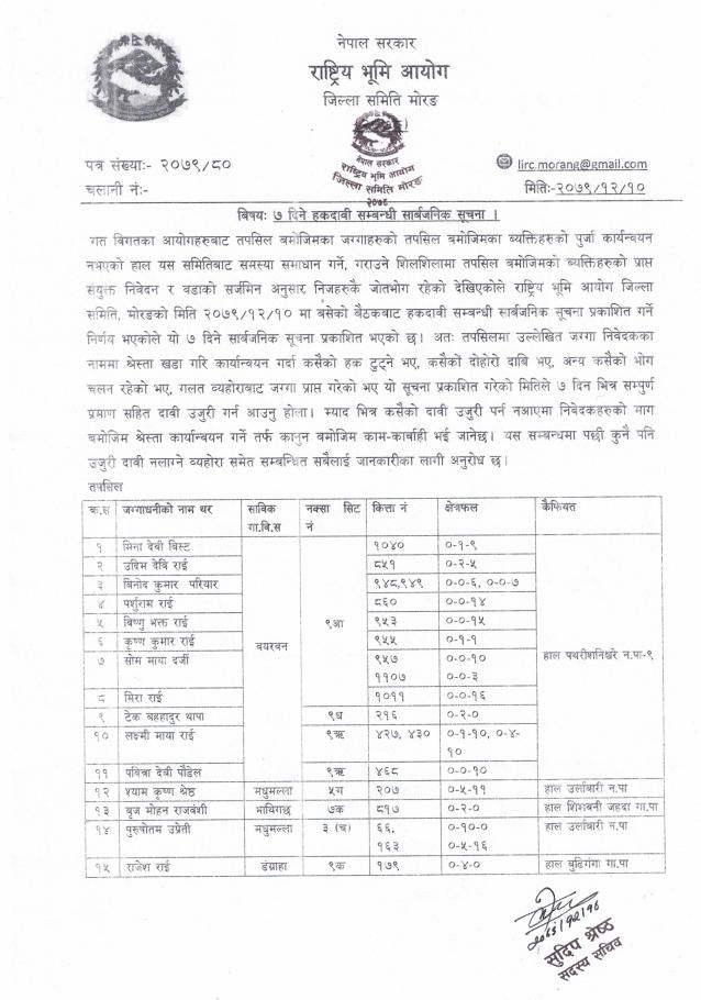 ७ दिने हकदाबी सम्बन्धी सार्वजनिक सूचना