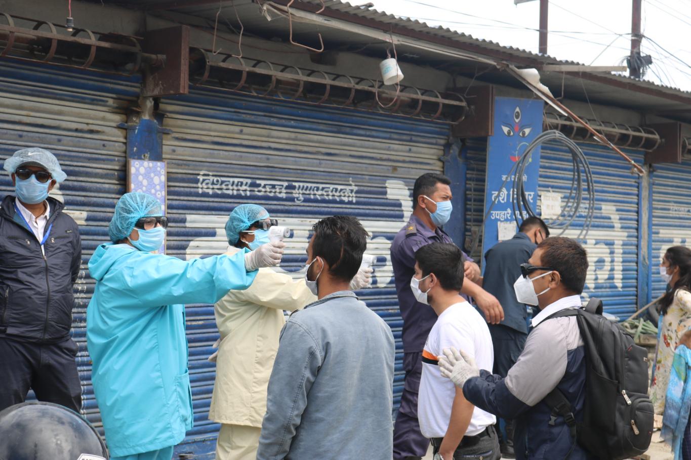 » काठमान्डौवाट बुढीगंगा आएका जम्मा ३१ जनाको ईलाका प्रहरी कार्यालय, नेमुवा मा थरमल थरममिटरबाट ज्वरो जाच गरिदै