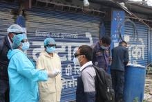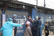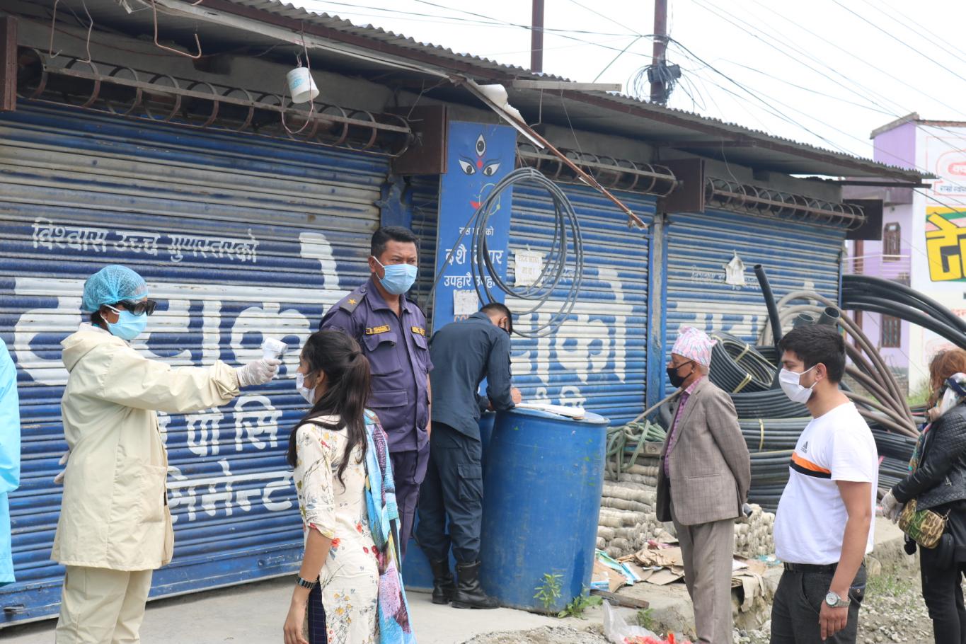 काठमान्डौवाट बुढीगंगा आएका जम्मा ३१ जनाको ईलाका प्रहरी कार्यालय, नेमुवा मा थरमल थरममिटरबाट ज्वरो जाच गरिदै